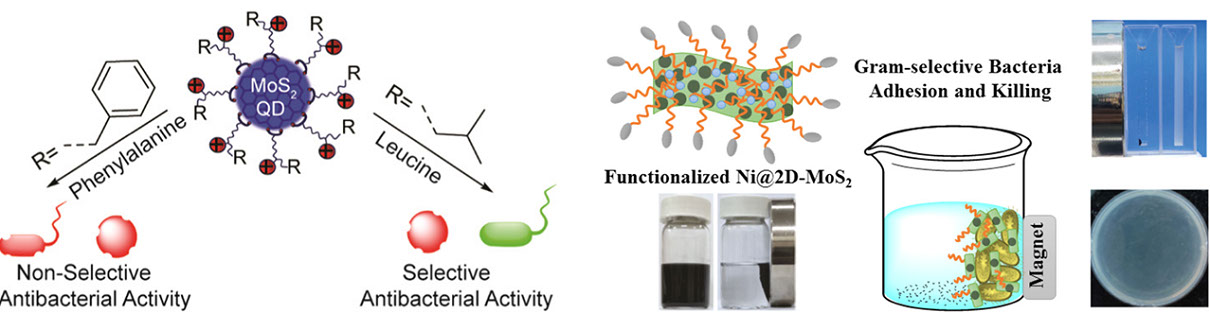 The layered materials can demonstrate strong and enhanced antimicrobial activity due to the sharp edge effect, terminal electron acceptor and strong interaction to the microbial membrane which lead to the destruction of membrane integrity. As the physical, electronic and surface properties can be modulated by using different materials and functional ligands we are exploring the cytotoxicity and antibacterial activity of chemically exfoliated and functionalized 2D materials.